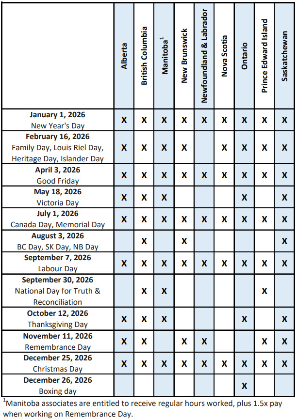 Paid Sick Time for Part-Time Associates: In certain provinces, part-time associates may accrue and be entitled to paid sick time as required by law.
